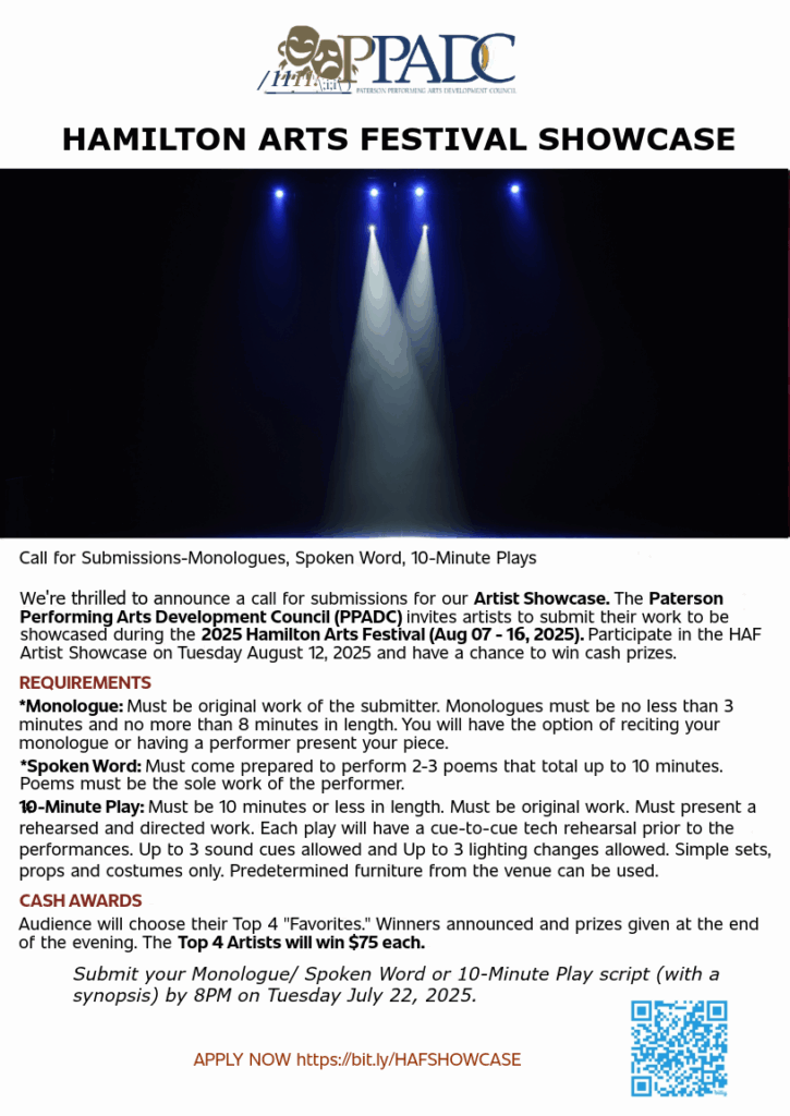 The Paterson Performing Arts Development Council (PPADC) is proud to present its 5th annual Hamilton Arts Festival, August 7 – 23, 2025, a series of events including plays and film screenings, showcasing local talent.